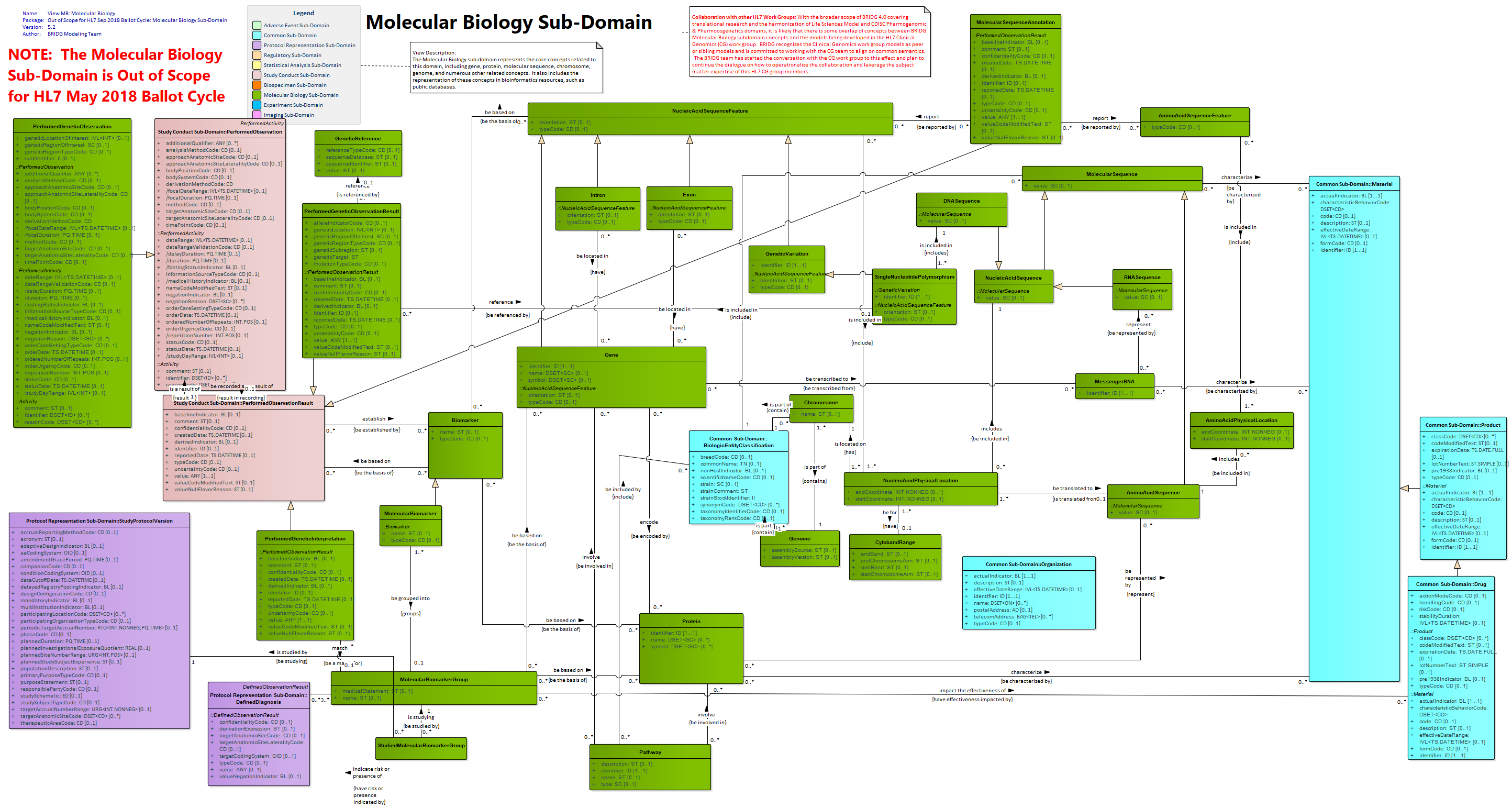 The Molecular Biology sub-domain represents the core concepts related to this domain, including gene, protein, molecular sequence, chromosome, genome, and numerous other related concepts.  Also includes the representation of these concepts in bioinformatics resources, such as public databases.  <br/><br/><font color="#ff0000"><b>Collaboration with other HL7 Work Groups</b>: With the broader scope of BRIDG 4.0 covering translational research and the harmonization of Life Sciences Model and CDISC Pharmogenomic & Pharmocogenetics domains, it is likely that there is some overlap of concepts between BRIDG Molecular Biology subdomain concepts and the models being developed in the HL7 Clinical Genomics (CG) work group.  BRIDG recognizes the Clinical Genomics work group models as peer or sibling models and is committed to working with the CG team to align on common semantics.  The BRIDG team has started the conversation with the CG work group to this effect and plan to continue the dialogue on how to operationalize the collaboration and leverage the subject matter expertise of this HL7 CG group members.  </font><br/>